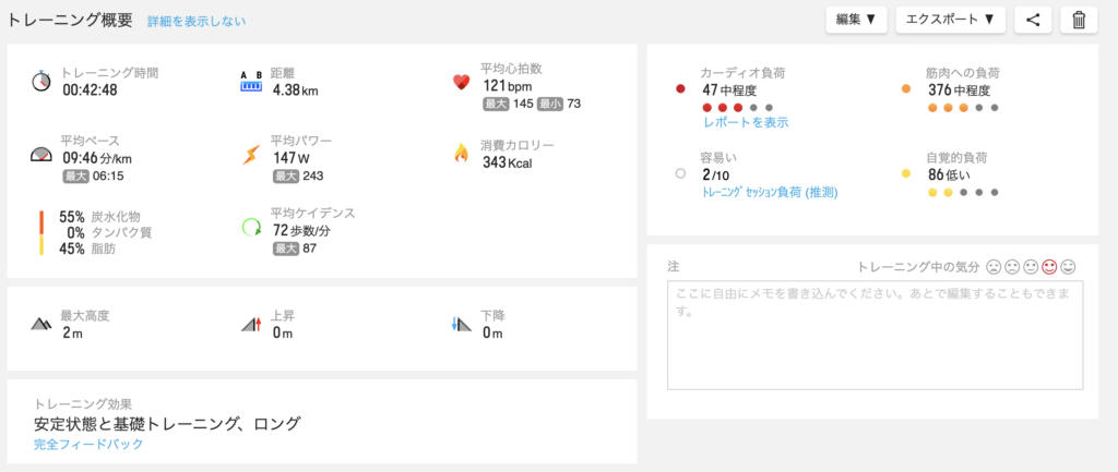 - ダイエットへの示唆: 内臓脂肪レベルが「11」または「11.5」で安定していますが、脂肪燃焼効率が高まっている今の状態で、心拍数を124bpm前後に抑えたLSD(ロングラン)を継続すれば、今後、体脂肪率(現在約20%前後)がより緩やかに、かつ確実に減少していくステージに入ると予想されます。